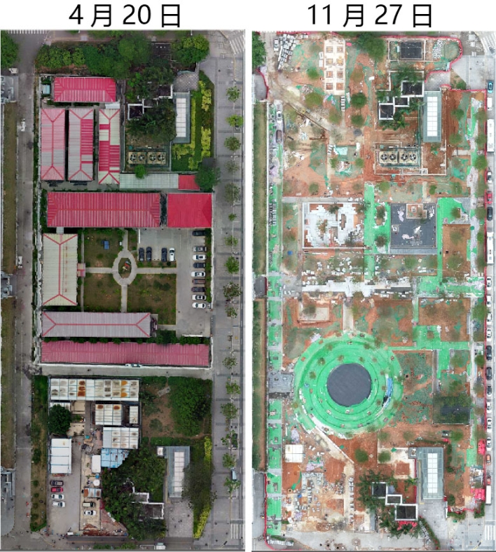 截至目前,測(cè)量組已經(jīng)開展了7次影像拍攝,對(duì)項(xiàng)目進(jìn)行動(dòng)態(tài)跟蹤,下圖是禮園動(dòng)土前后的影像對(duì)比。