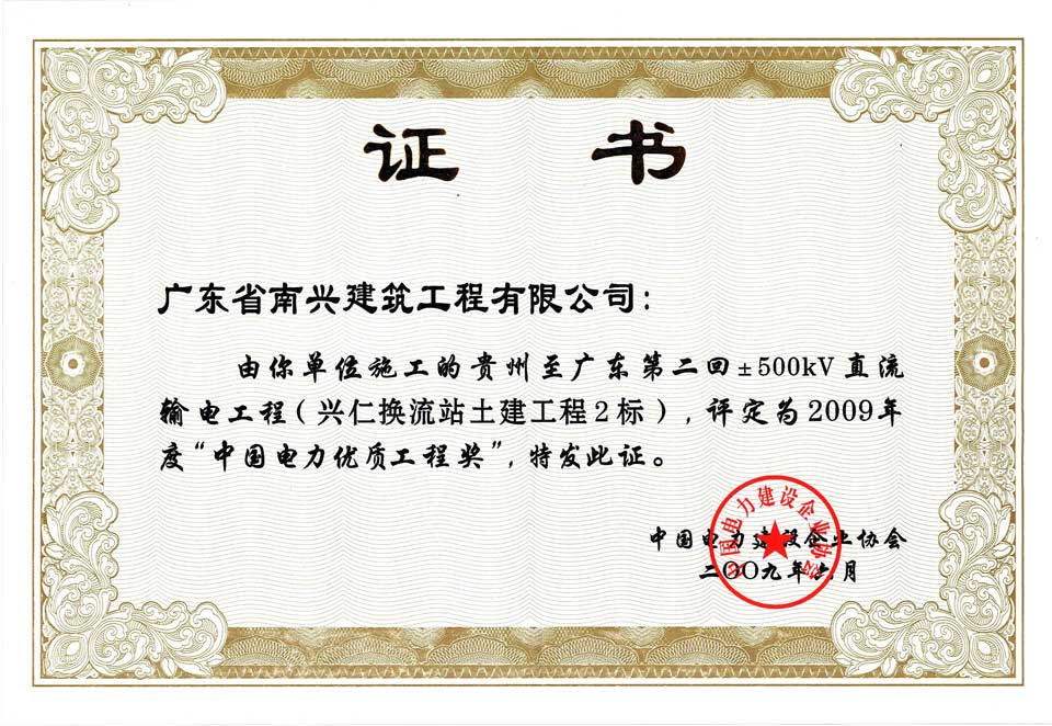 貴州至廣東第二回±500KV直流輸電工程(興仁換流站土建工程2標)獲優(yōu)質工程獎(2009年)