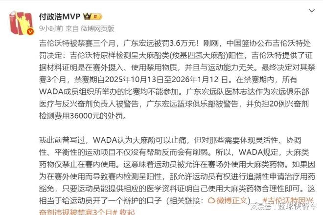 廣東外援吉倫沃特終究還是逃脫不了罰單。在經(jīng)過多方探討后,中國(guó)籃協(xié)針對(duì)吉倫沃特比賽期間使用違禁藥做出最終處罰。根據(jù)籃協(xié)公布的最終結(jié)果,吉倫沃特將被直接禁賽三個(gè)月,而廣東隊(duì)則被警告,并且被處罰3.6萬罰款(承擔(dān)檢測(cè)費(fèi))。而頗為幸運(yùn)的是,吉倫沃特和廣東隊(duì)這一次雖然被處罰,不過,作為球隊(duì)的主教練和總經(jīng)理,杜鋒和朱芳雨卻“幸運(yùn)”的躲過罰單,并沒有在處罰名單上。