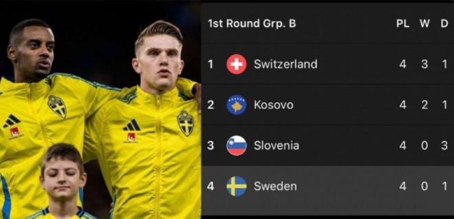 4輪比賽結束后,瑞典隊一場沒贏,只拿到1個積分,小組墊底,落后第1名瑞士9分,落后第2名科索沃6分,落后第3名斯洛文尼亞2分。目前,瑞典已經(jīng)確定無緣小組第1,無法直接晉級世界杯。