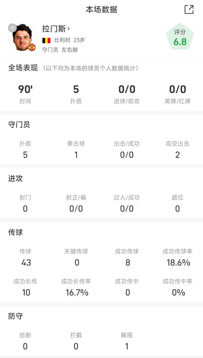 拉門(mén)斯戰(zhàn)利物浦全場(chǎng)數(shù)據(jù):貢獻(xiàn)5次撲救助曼聯(lián)客場(chǎng)取勝